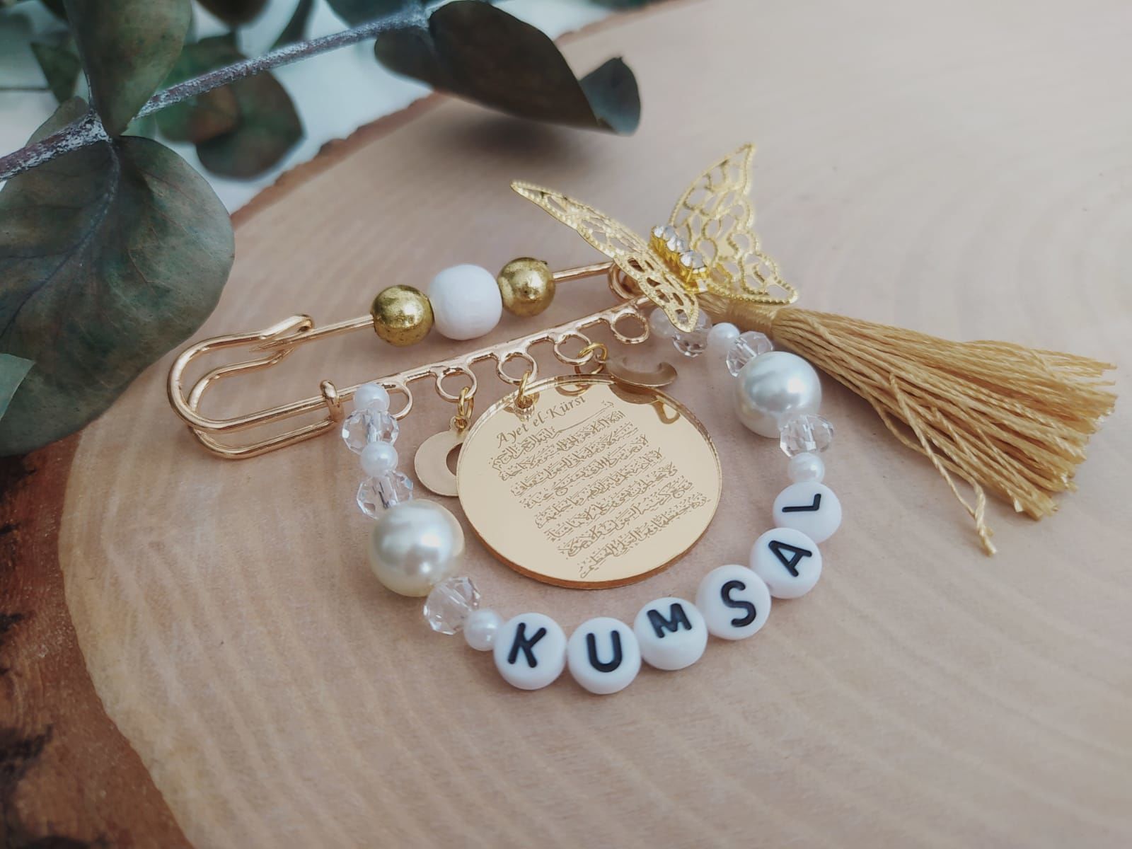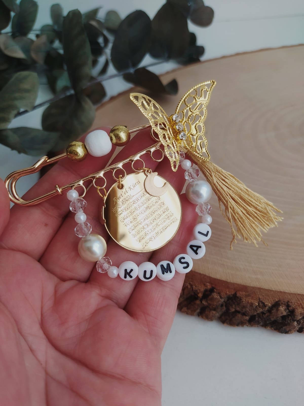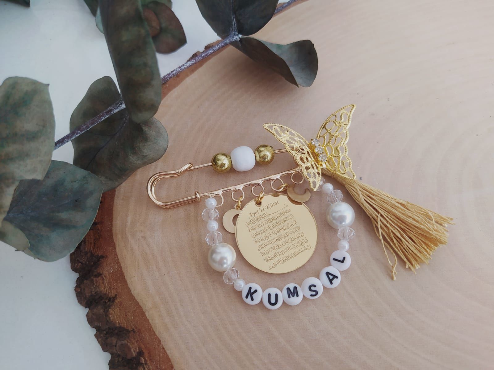 Ayetel Kürsi Dualı İsimli Süslemeli Bebek Nazarlık Yaka İğnesi Bebek Maşallah İğnesi Bebek Hediye
