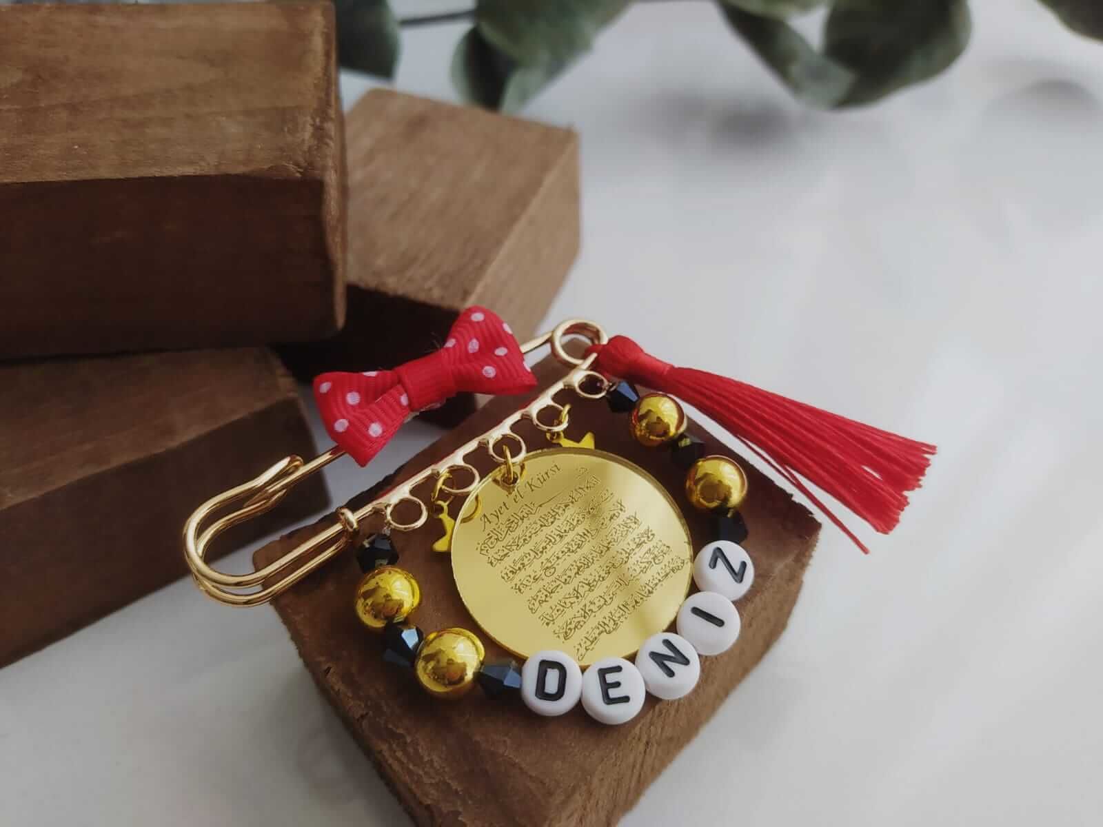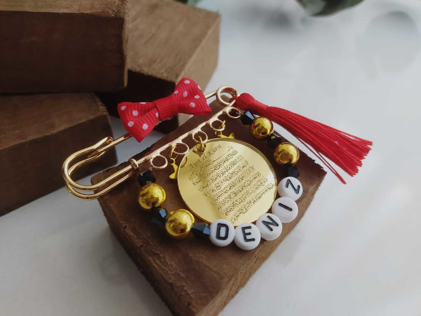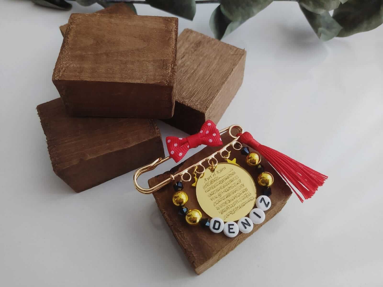Ayetel Kürsi Yazılı İsimli Süslemeli Bebek Nazarlık Yaka İğnesi Kırmızı