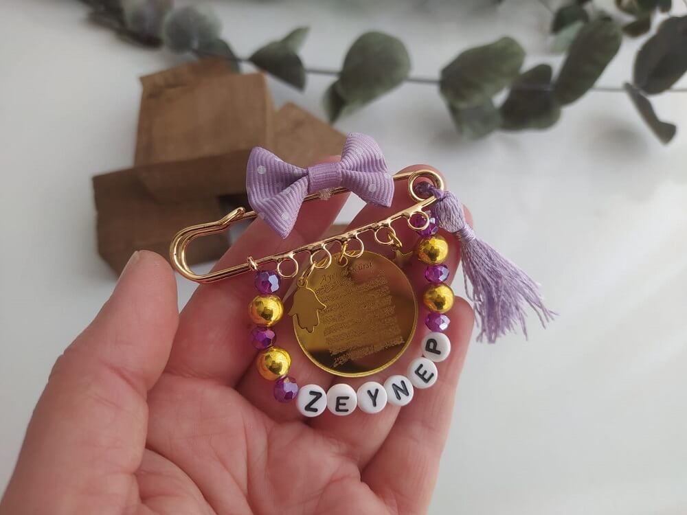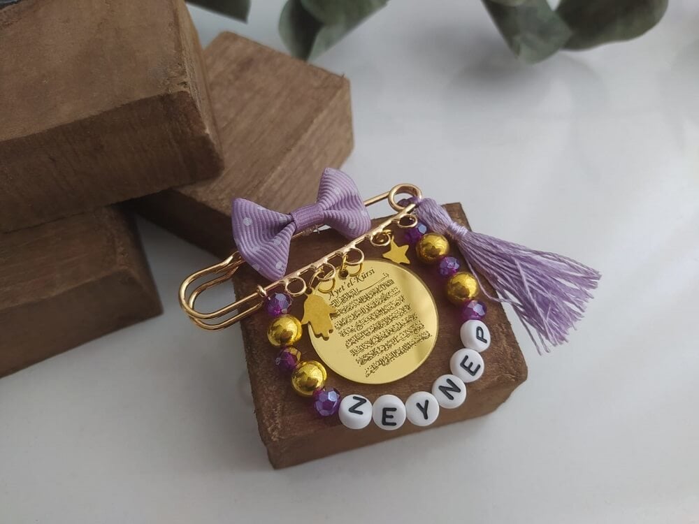 Ayetel Kürsi Yazılı İsimli Süslemeli Kız Bebek Nazarlık Yaka İğnesi Lila