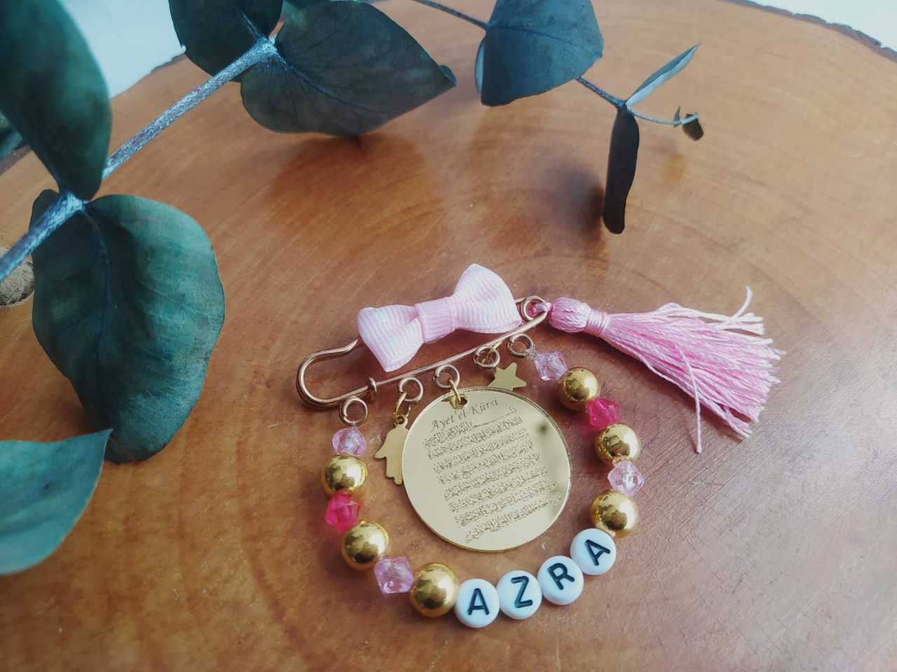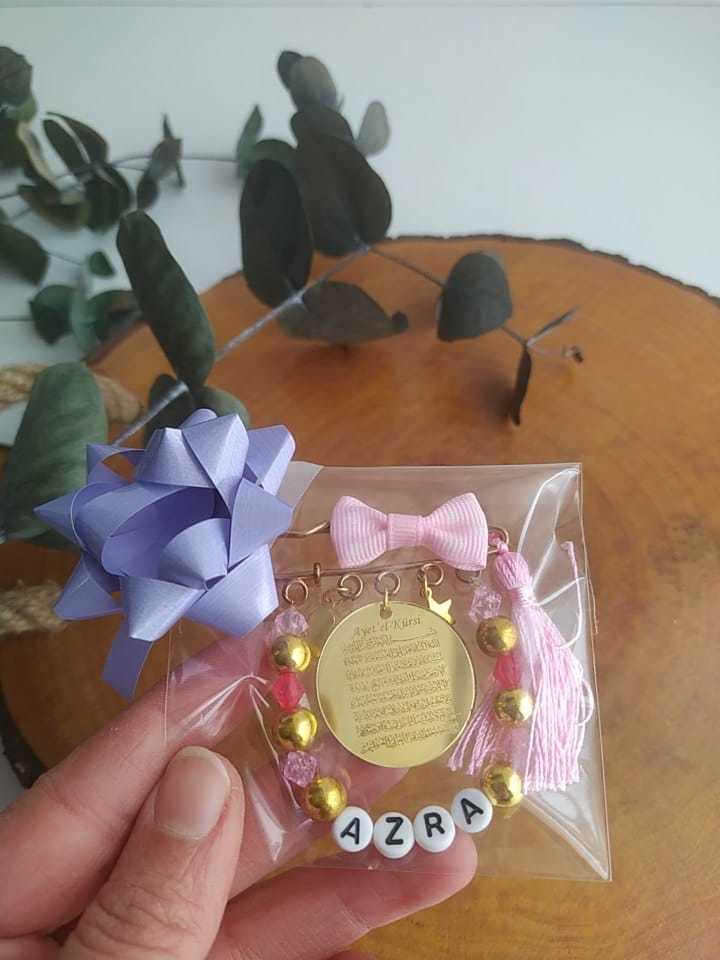 Ayetel Kürsi Yazılı İsimli Süslemeli Kız Bebek Nazarlık Yaka İğnesi Pembe